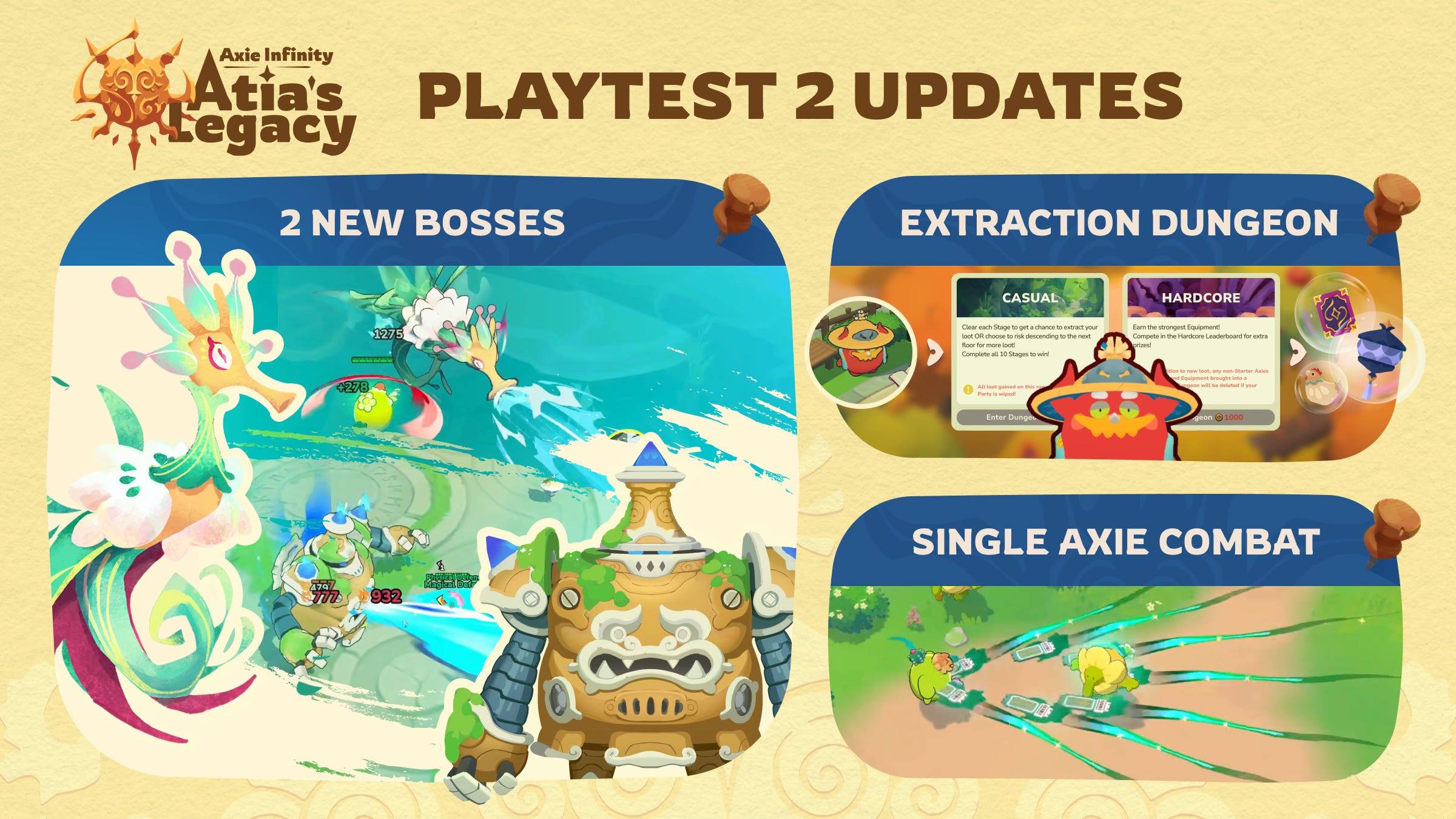 What’s in the playtest: Combat has been rebuilt around single axie control with a basic attack, an ultimate, and a dash. This playtest also introduces a 10-stage dungeon mode, five new weapons, and two new bosses. Full details below.
