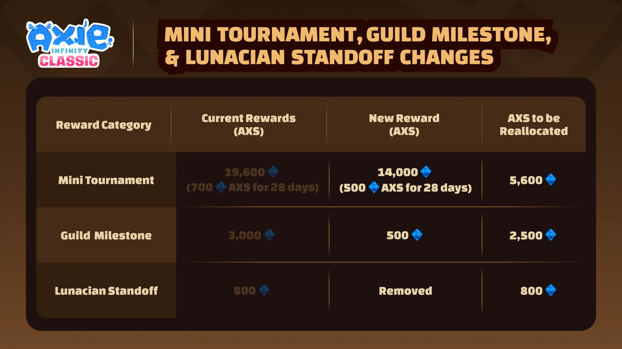 We’ve updated reward structures by shifting about 8,900 AXS from Guild Milestones, Mini-Tournaments and the Lunacian Standoff to the Guild and new Arena Leaderboards. More details below.