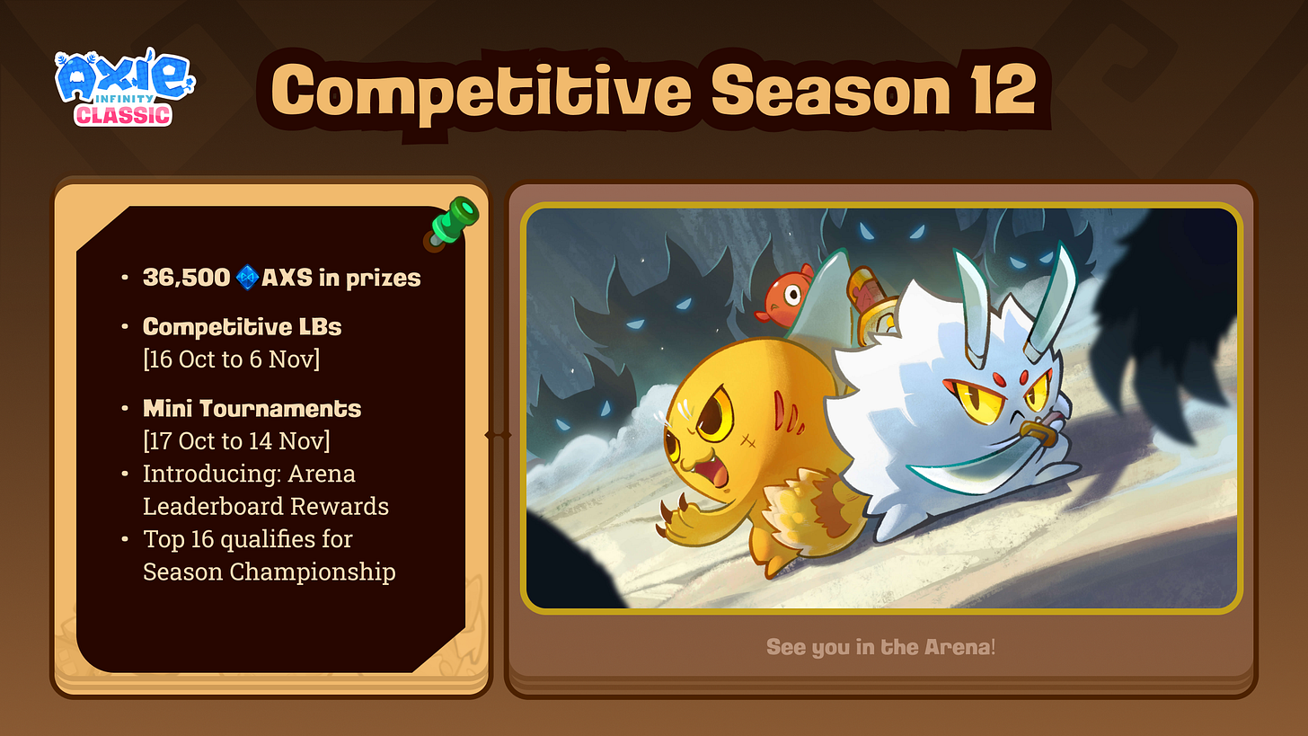 Axie Classic Competitive Season 12 is LIVE! Jump into the arena to battle it out for part of the 36K AXS in rewards up for grabs. Here’s what’s happening: