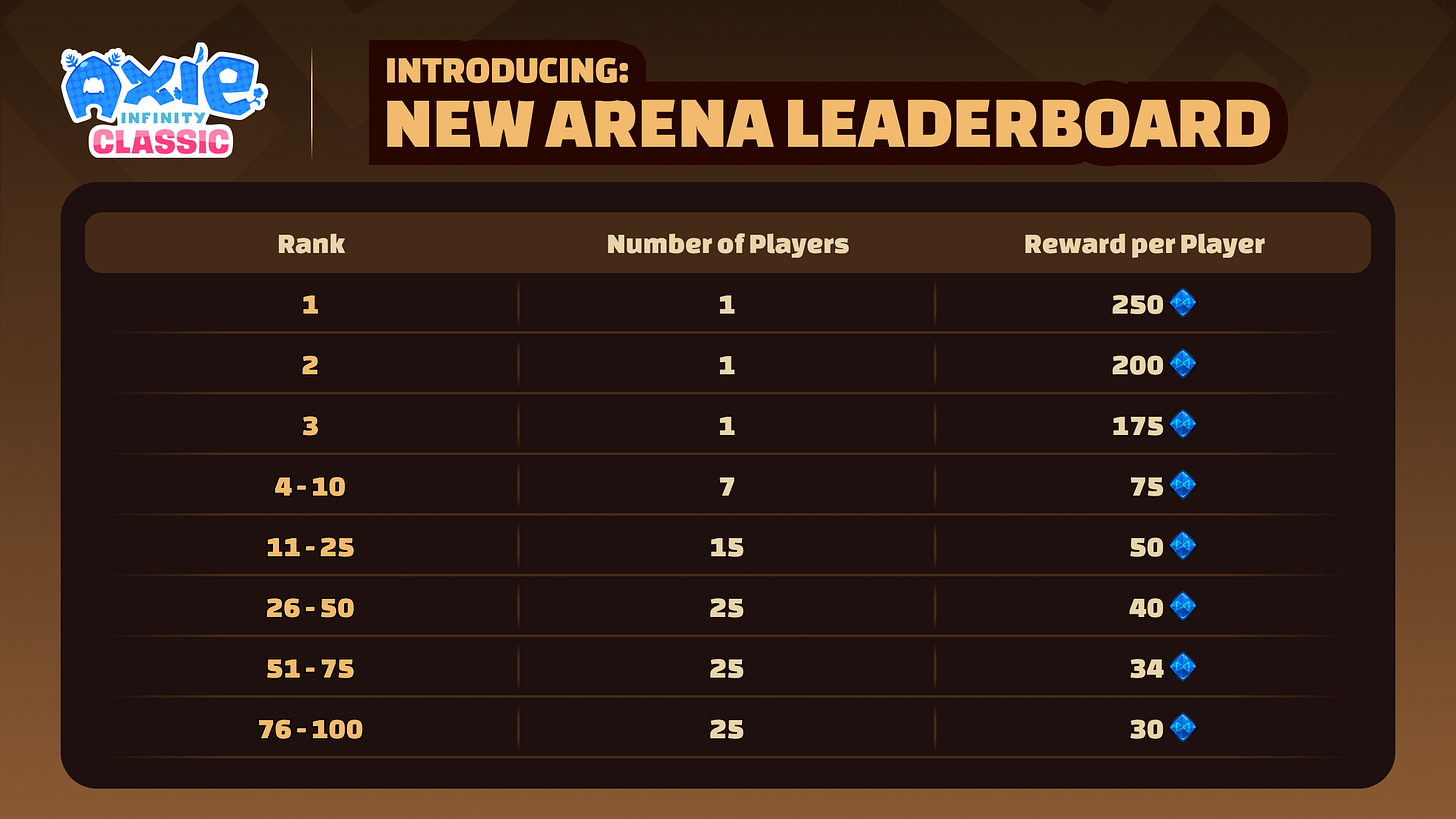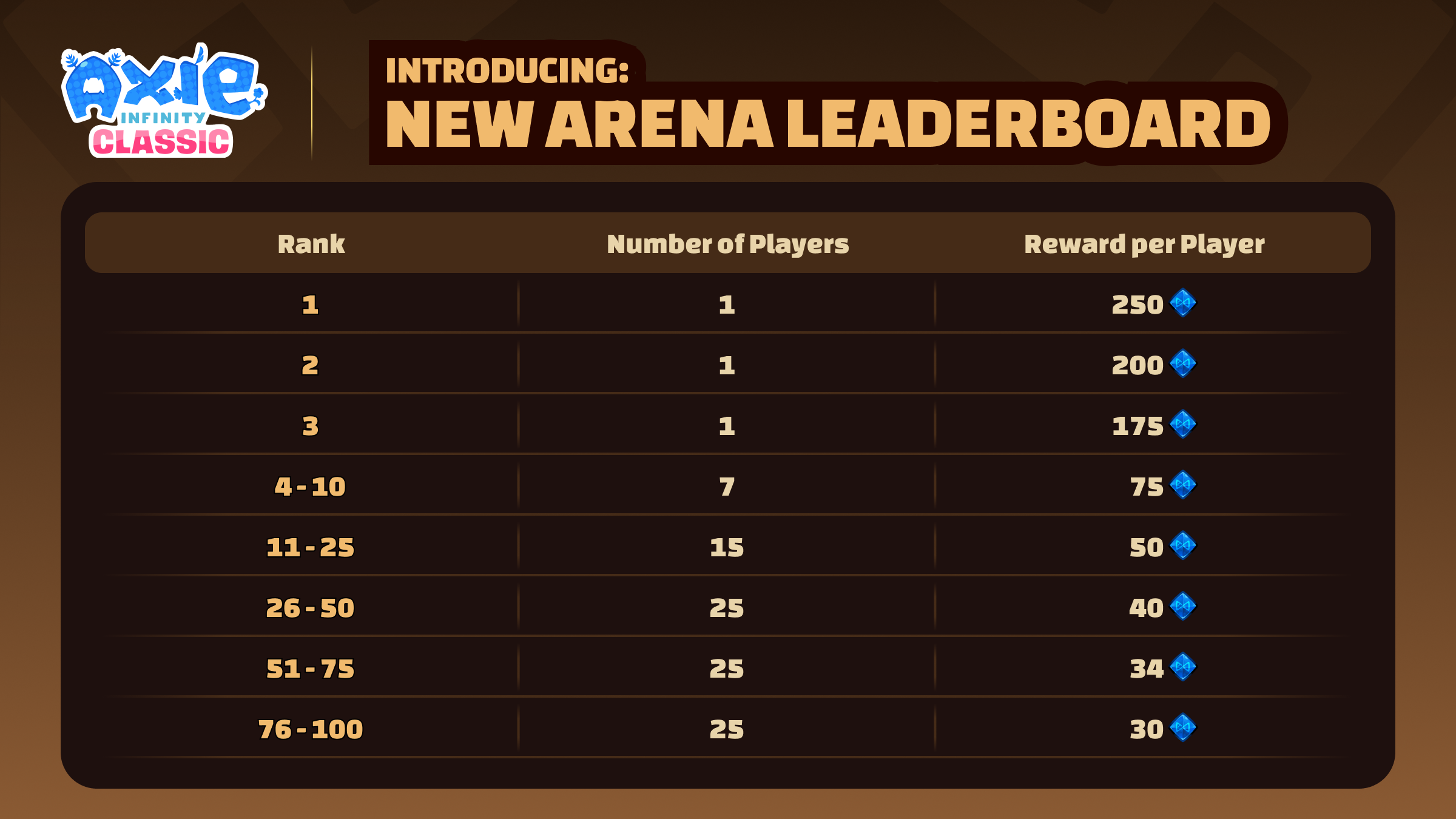 What is Classic without an Arena Leaderboard? This new and experimental Arena Leaderboard will reward the Top 100 individual players in ranked play. The total prize pool is 4,500 AXS! We’re doing this to make sure individual and guild-based achievements get the recognition they deserve.
