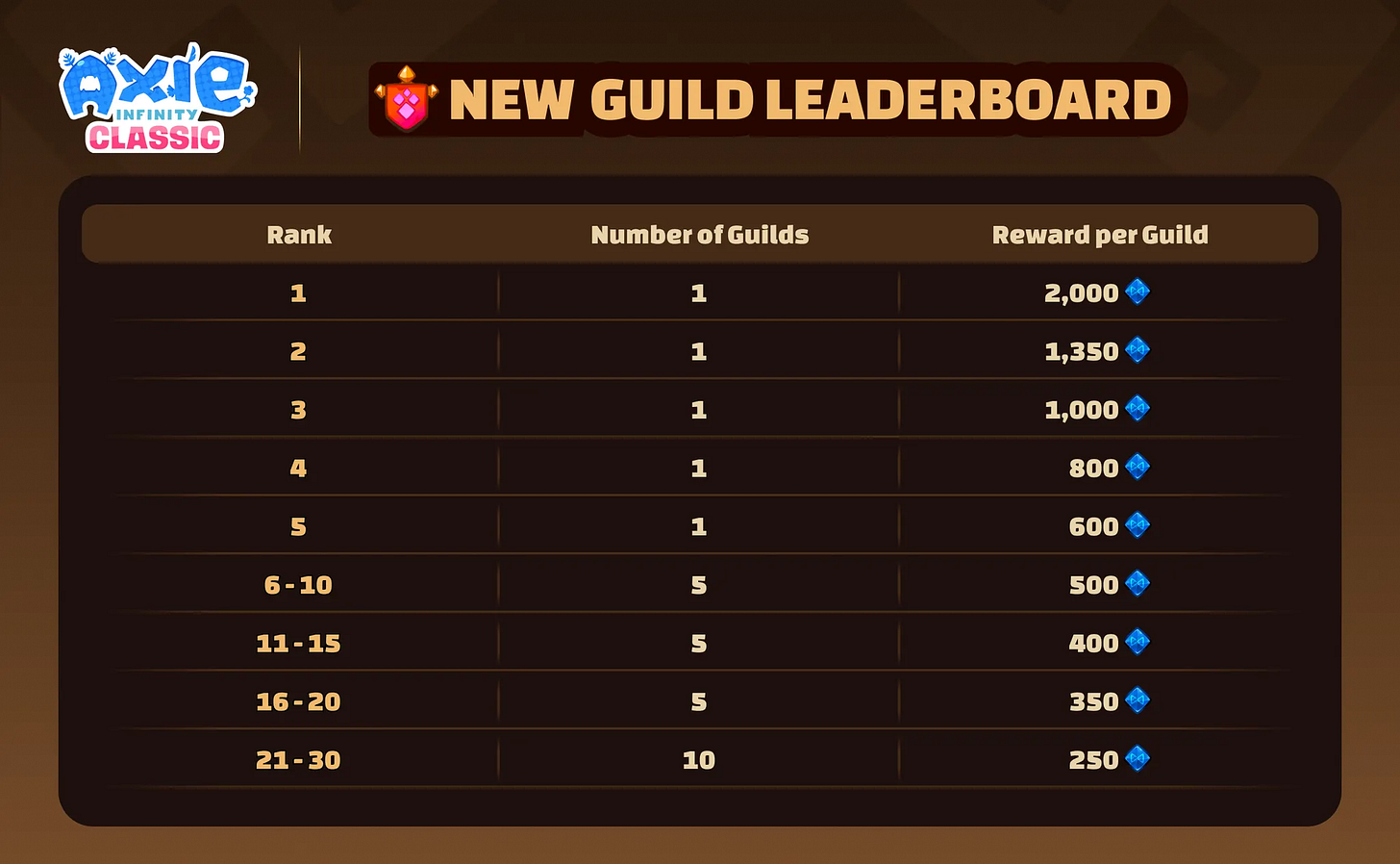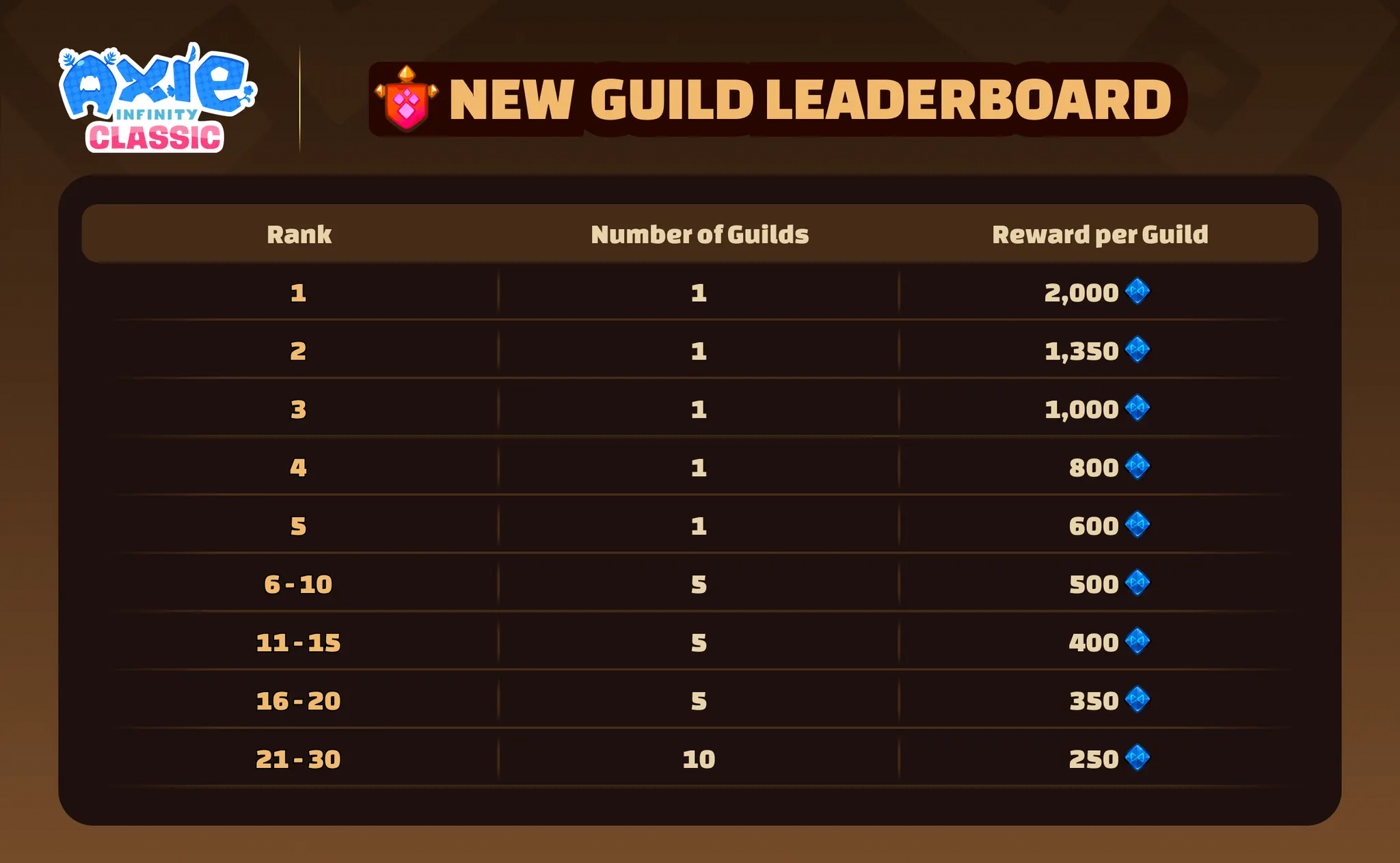 The Guild Leaderboard will expand from 20 to 30 guilds! This will give more guilds more opportunities to earn from the increased 14,500 AXS prize pool. We’re looking forward to even more competitive guild gameplay!