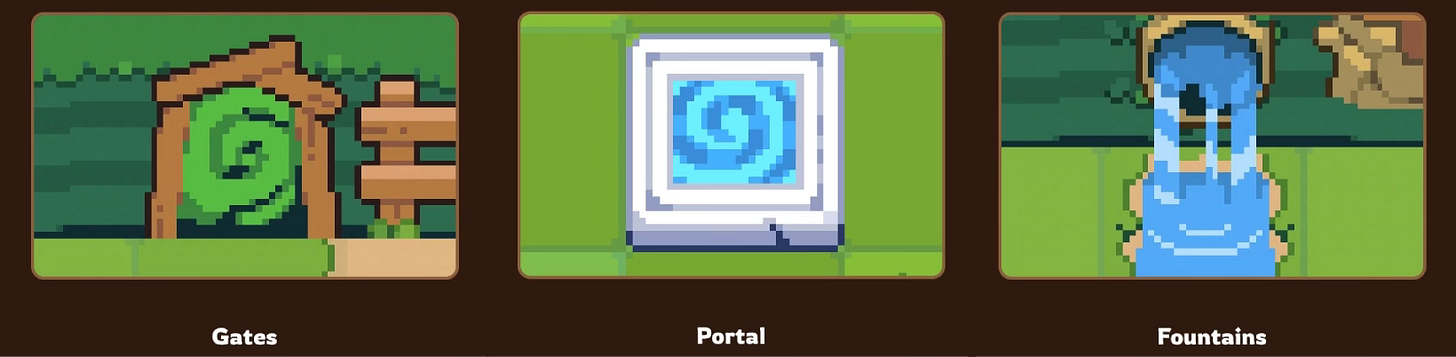 Gates: teleport elsewhere on the floor (costs Treasure)