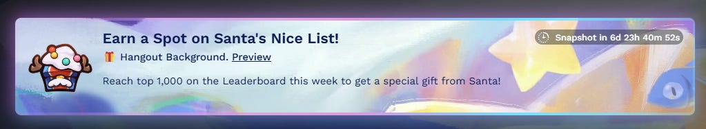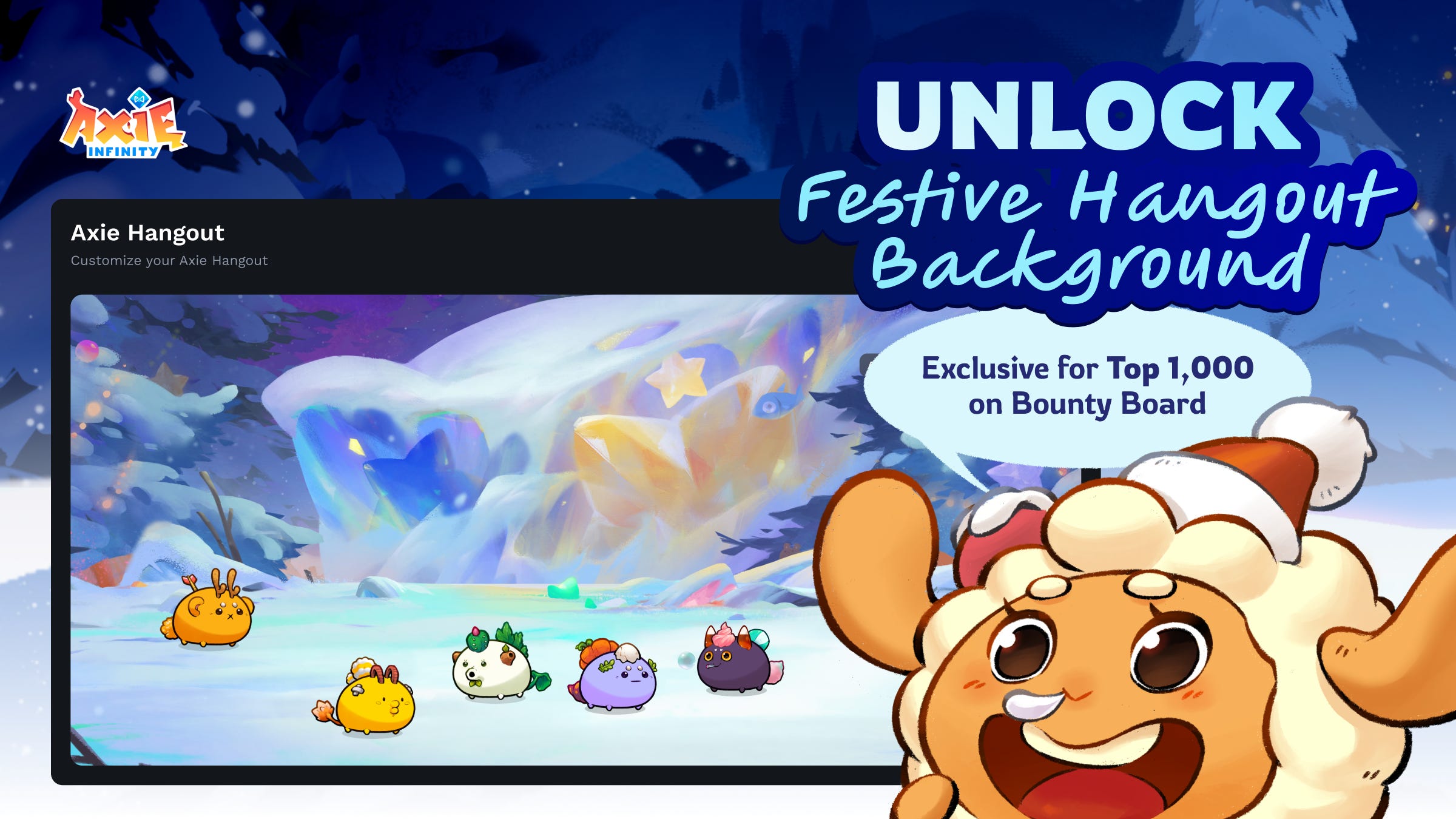 Axie Hangouts can now have animated backgrounds! Place in the Top 1,000 on the weekly Bounty Board until December 28th —> Get on Santa’s Nice List —> Unlock the new animated Christmas-themed background.