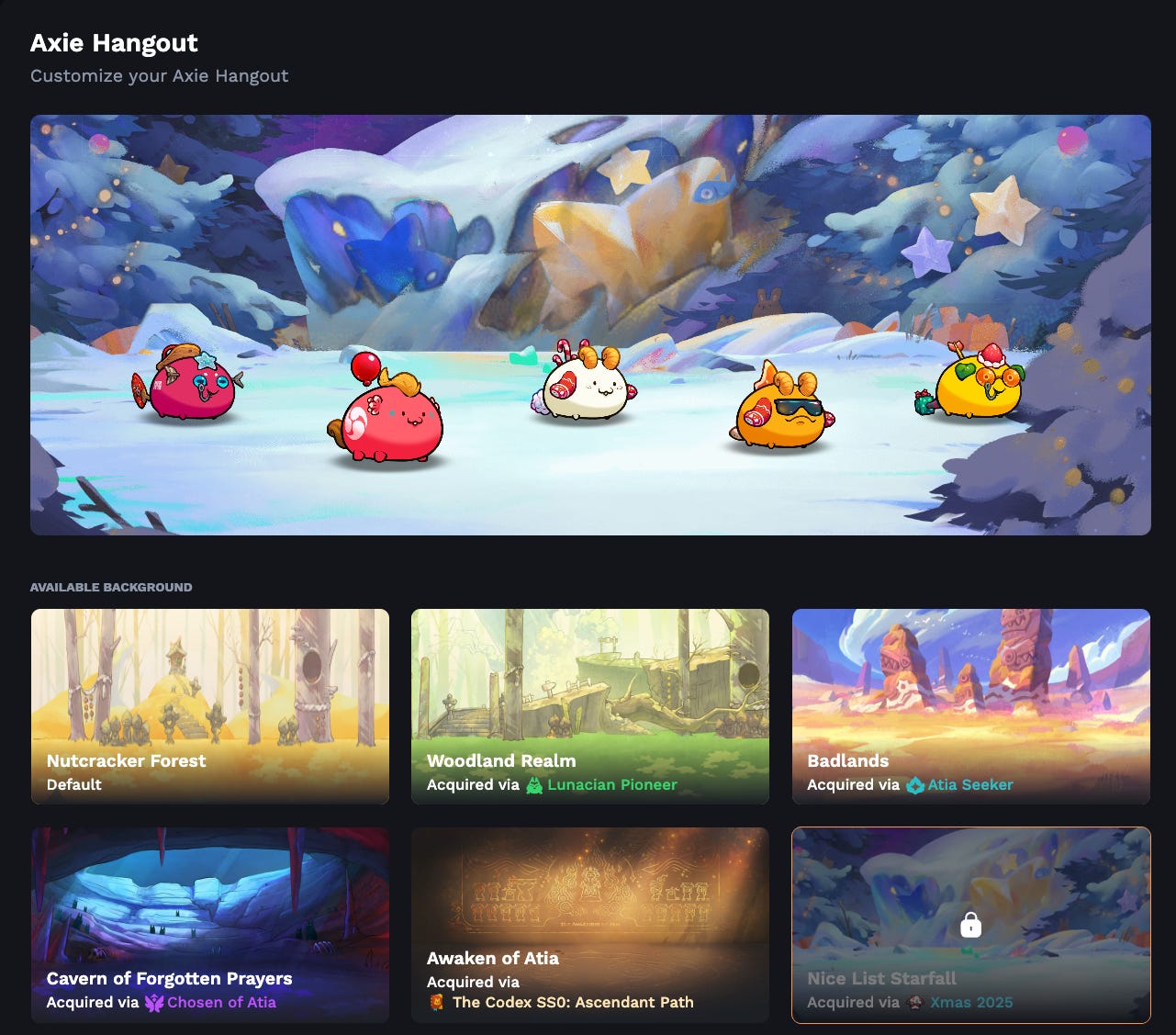 Nice List Starfall is an exclusive and unlockable Axie Hangout background. Finish in the Top 1,000 on the weekly Axie Bounty Board during the Dec 22–28 event period to get one. This the first Axie Hangout background with its own animation! It’s a way to bring your own little corner of Lunacia to life.