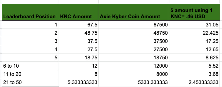 25% of the KNC (500) will be distributed to the top 50 spots on the leaderboard at the end of the season. The season will last 2 weeks, ending on May 3rd at 10 AM EST.