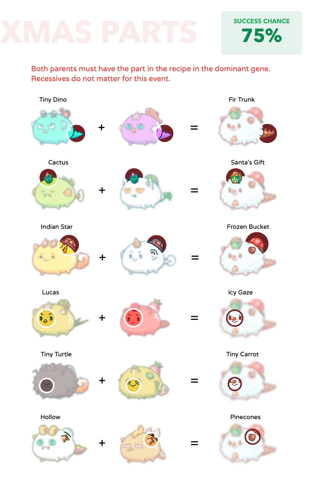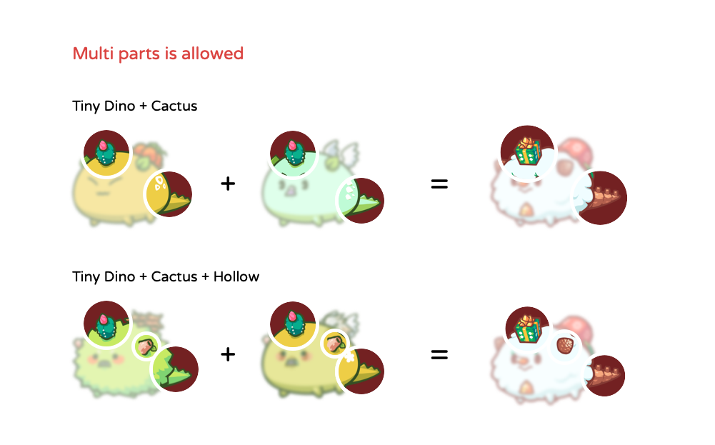Holiday skins are special limited edition parts that have a unique, holiday-themed look. They take the place of an “ordinary” part and require a special recipe to create. Once the window for breeding these parts passes, they can never be created again!