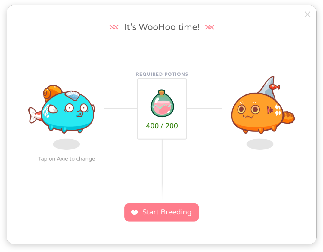 The cost to breed two Axies will be based on the breed count of both parents. For example, two Axies that have 6 breeds each will require 2,600 Small Love Potions to mate.