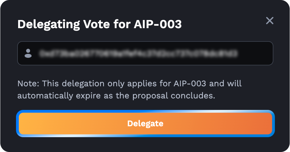 A: No, you can revoke Voting Power Delegation as long as your delegatee has not cast a vote yet. If you want to delegate Voting Power during the next AIP, you’ll need to re-enter your delegatees’ addresses.