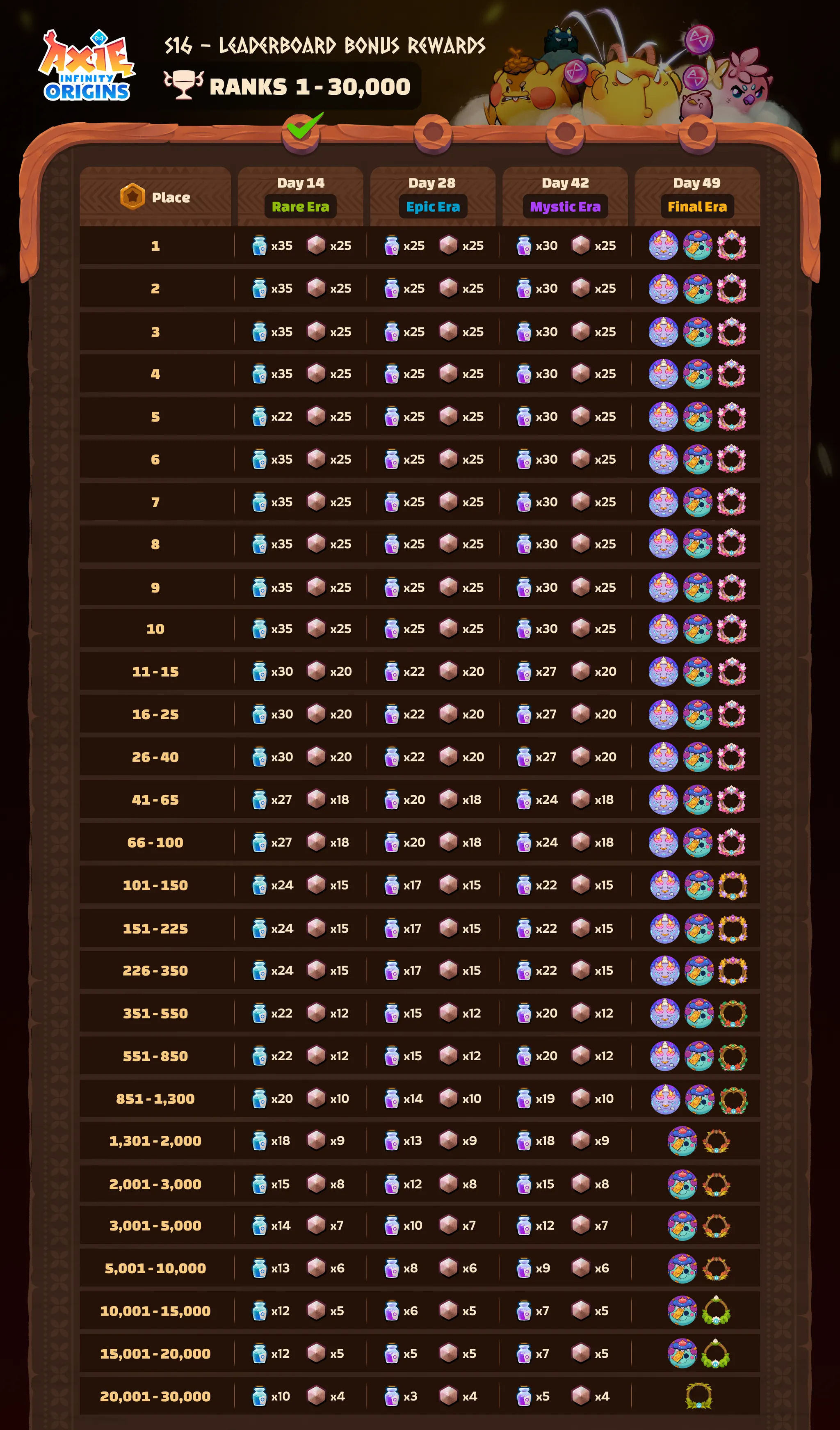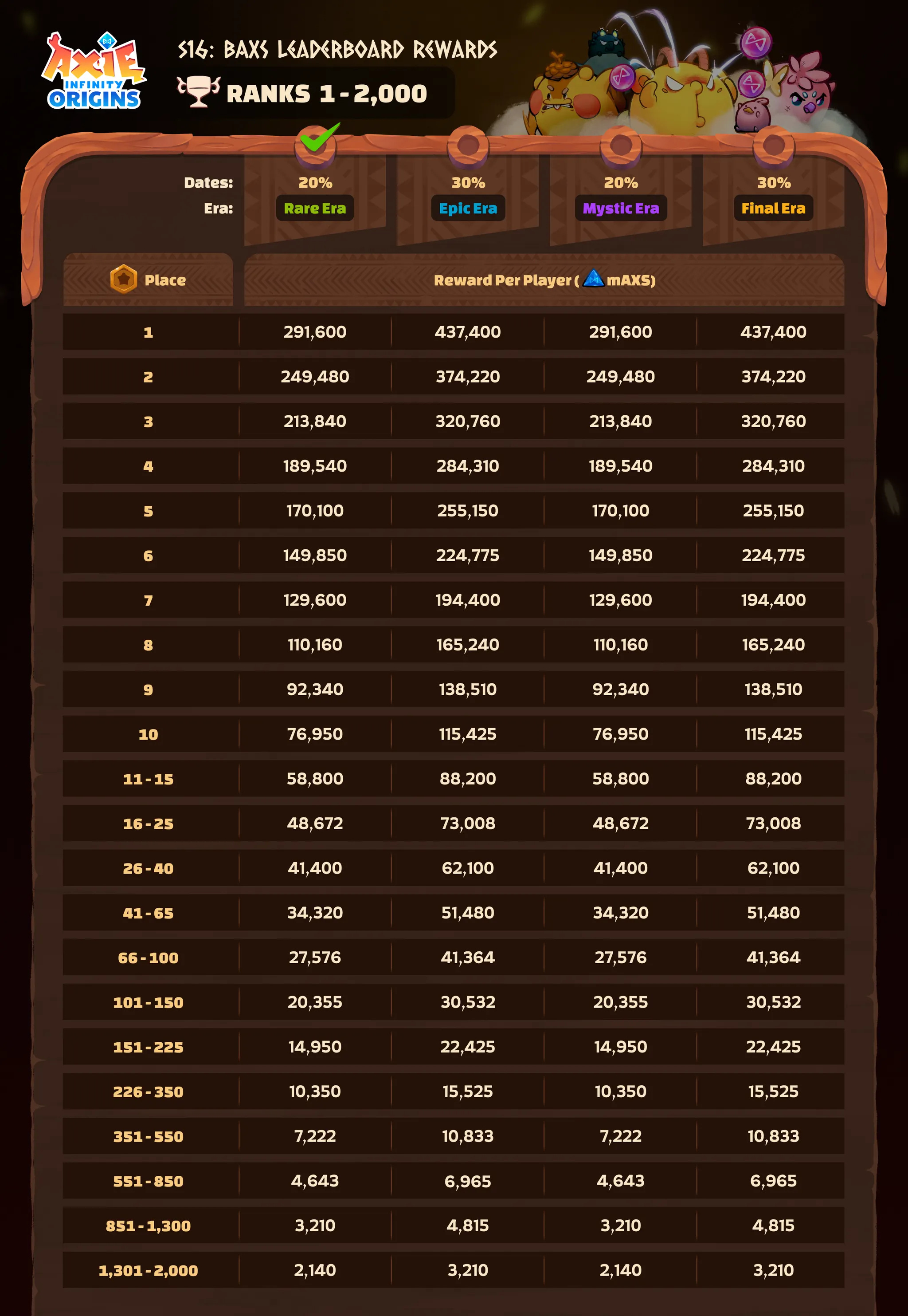 In S16, the Top 2,000 players will share an 80K bAXS prize pool. The Rare Era alone features 20K bAXS in rewards, alongside additional bonus incentives.