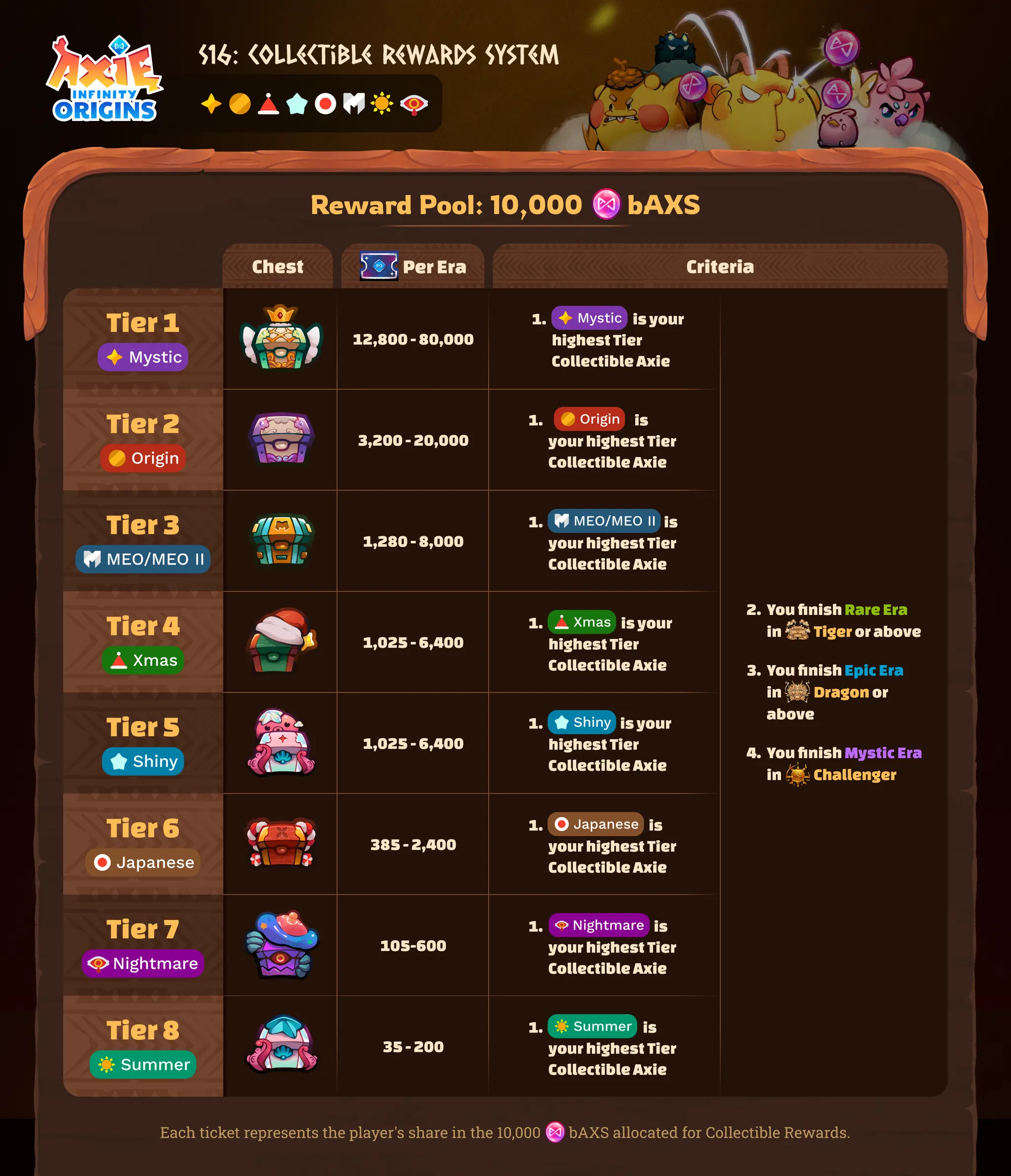 Collectible Chest Reminder: Collectible axie holders who finish the Rare Era at Tiger rank or higher while holding their collectible axie throughout the entire era will earn Collectible Chests containing Tickets redeemable for a share of a 10,000 bAXS prize pool.