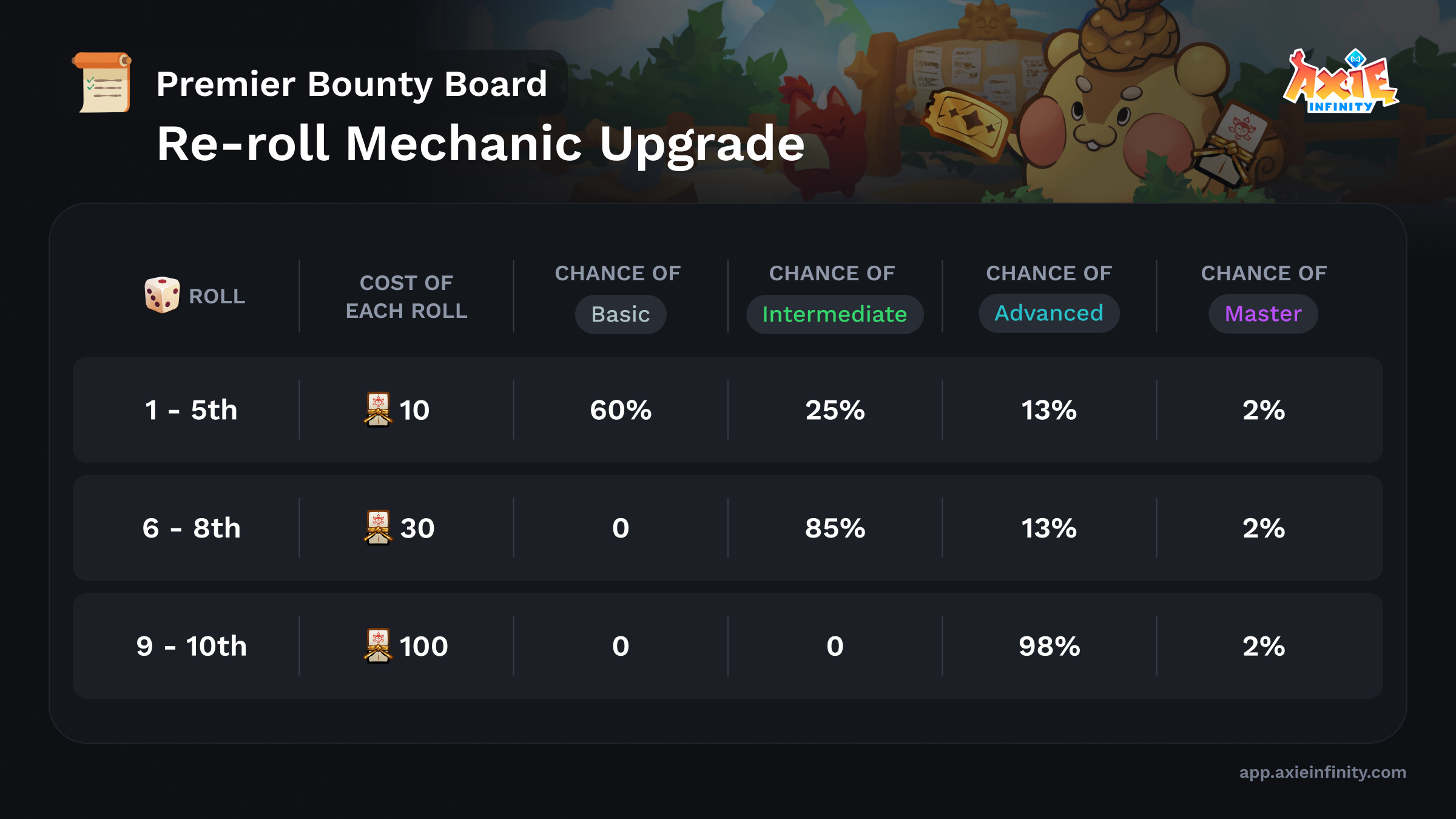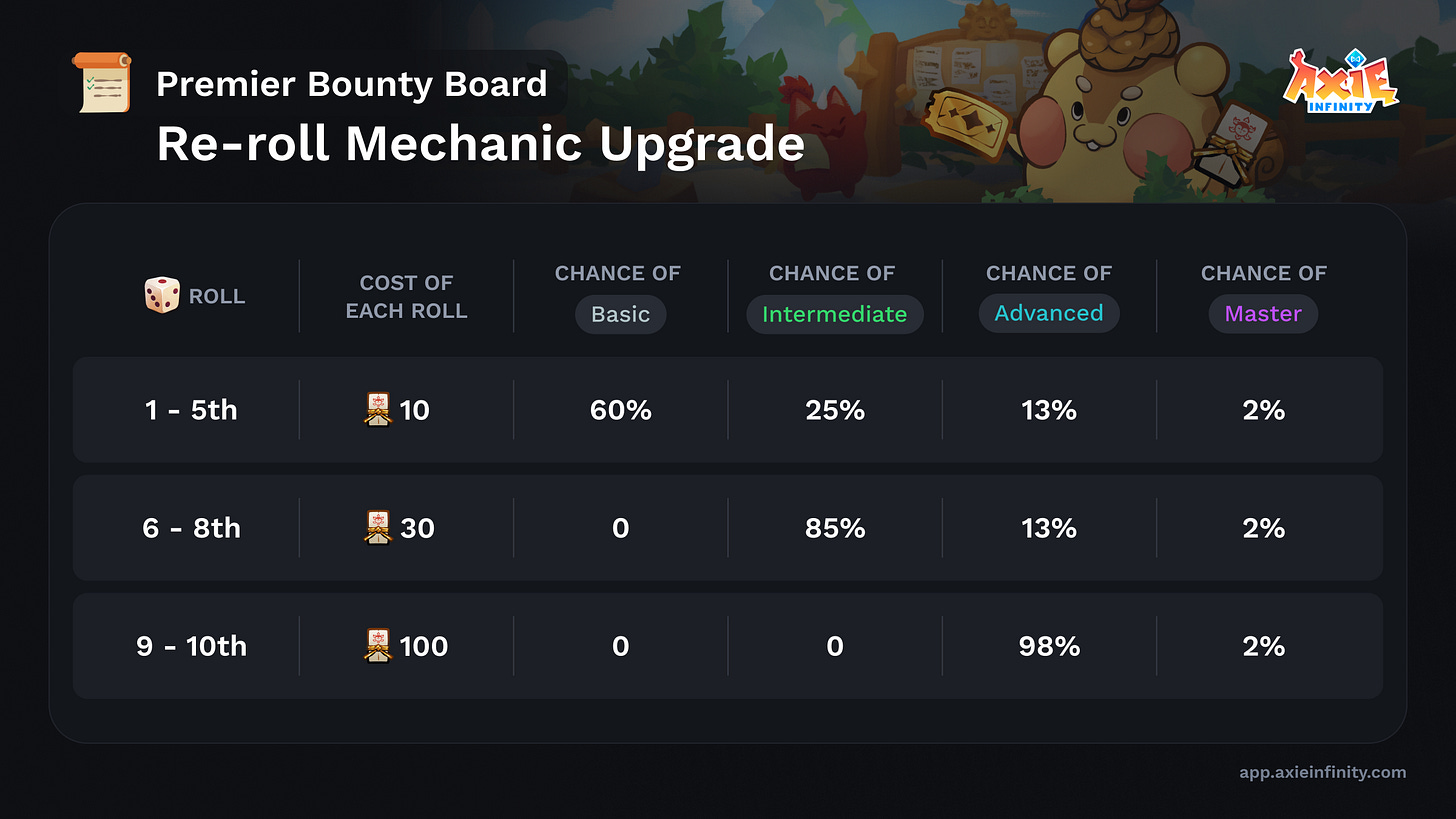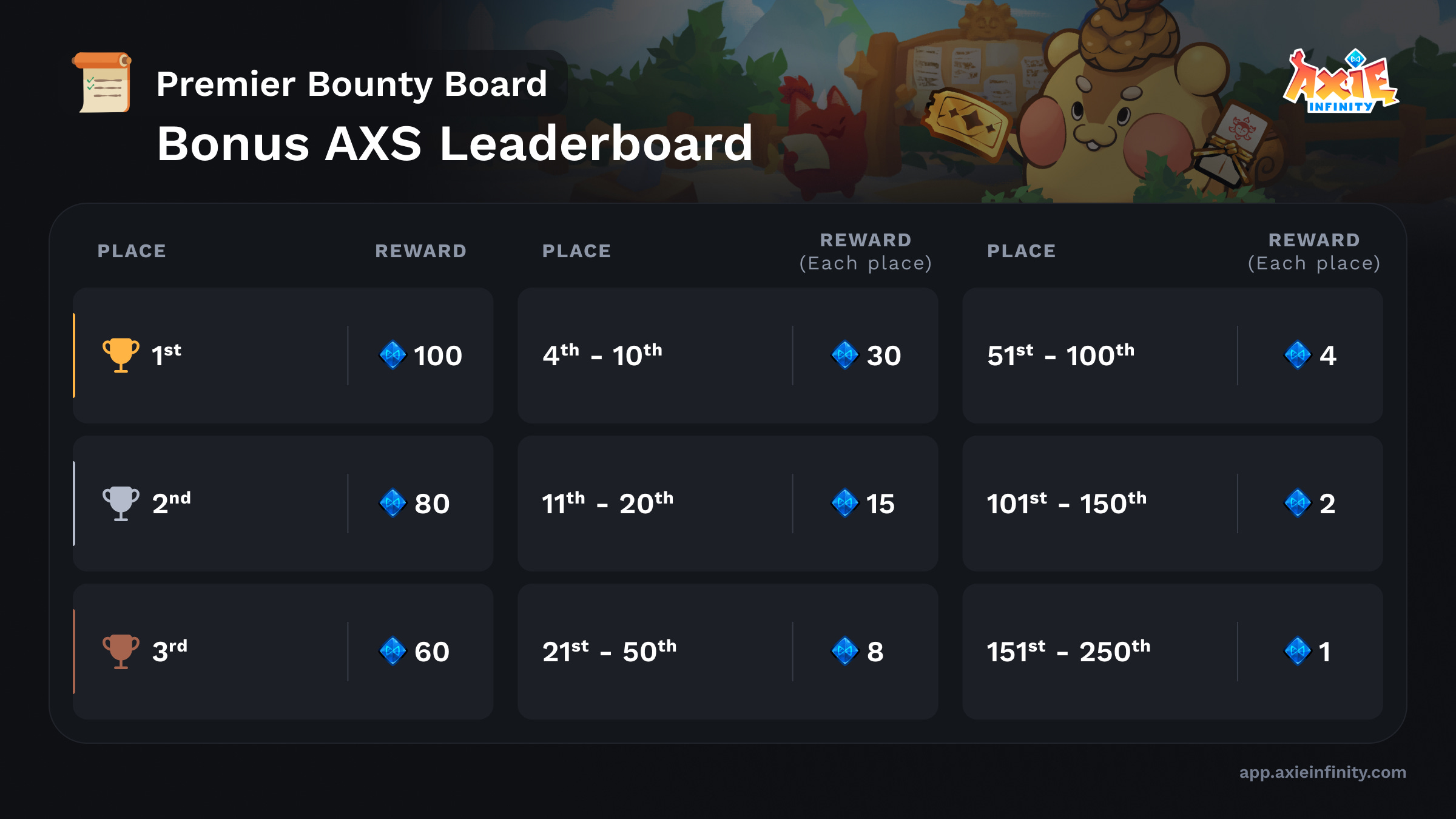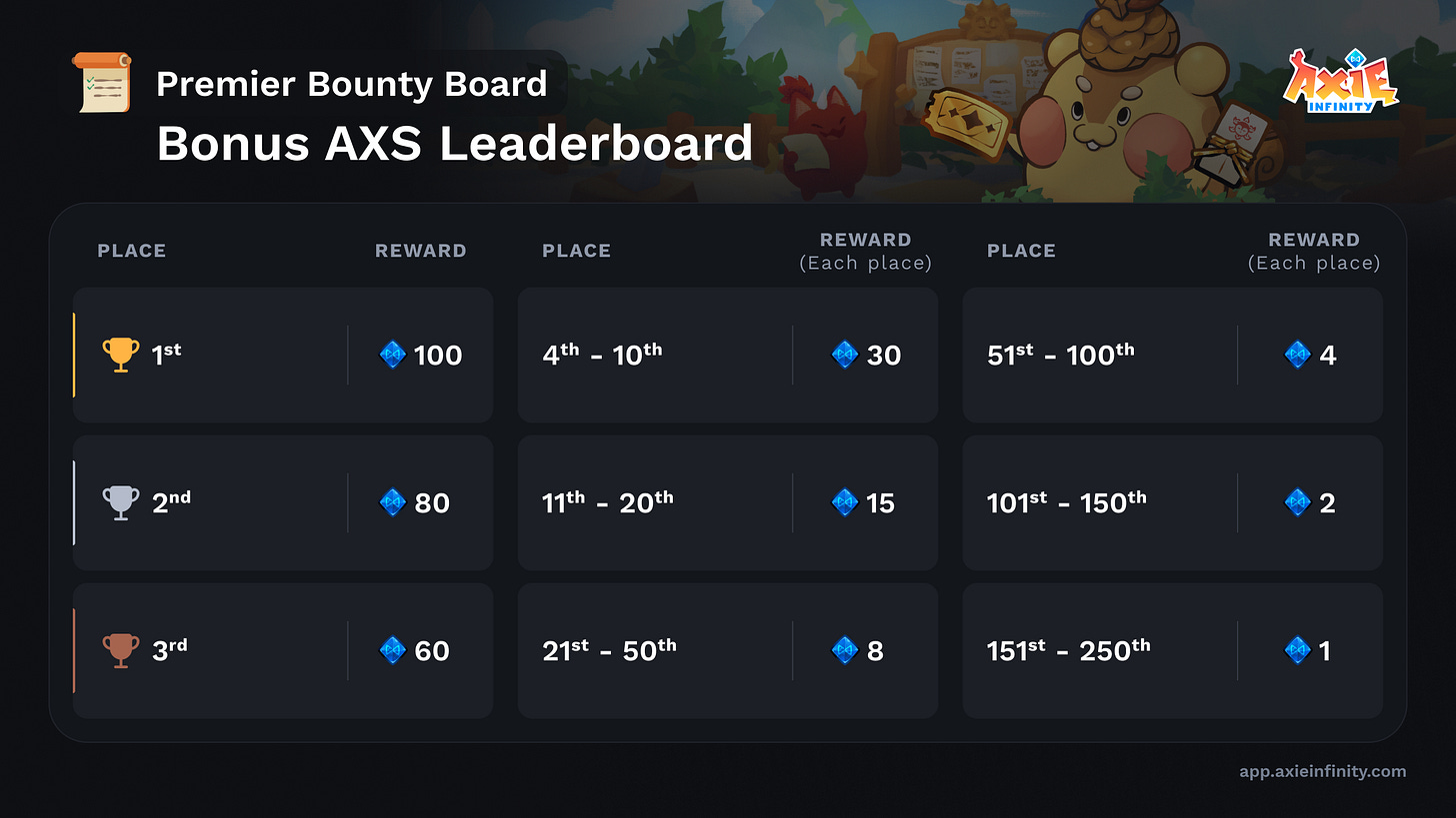 We will enhance the rewards for the Premier Bounty Board. The top 250 on the leaderboard will share in a weekly 1,000 AXS prize pool. We’ve also added 1,000 AXS to the Master Quest reward pool.