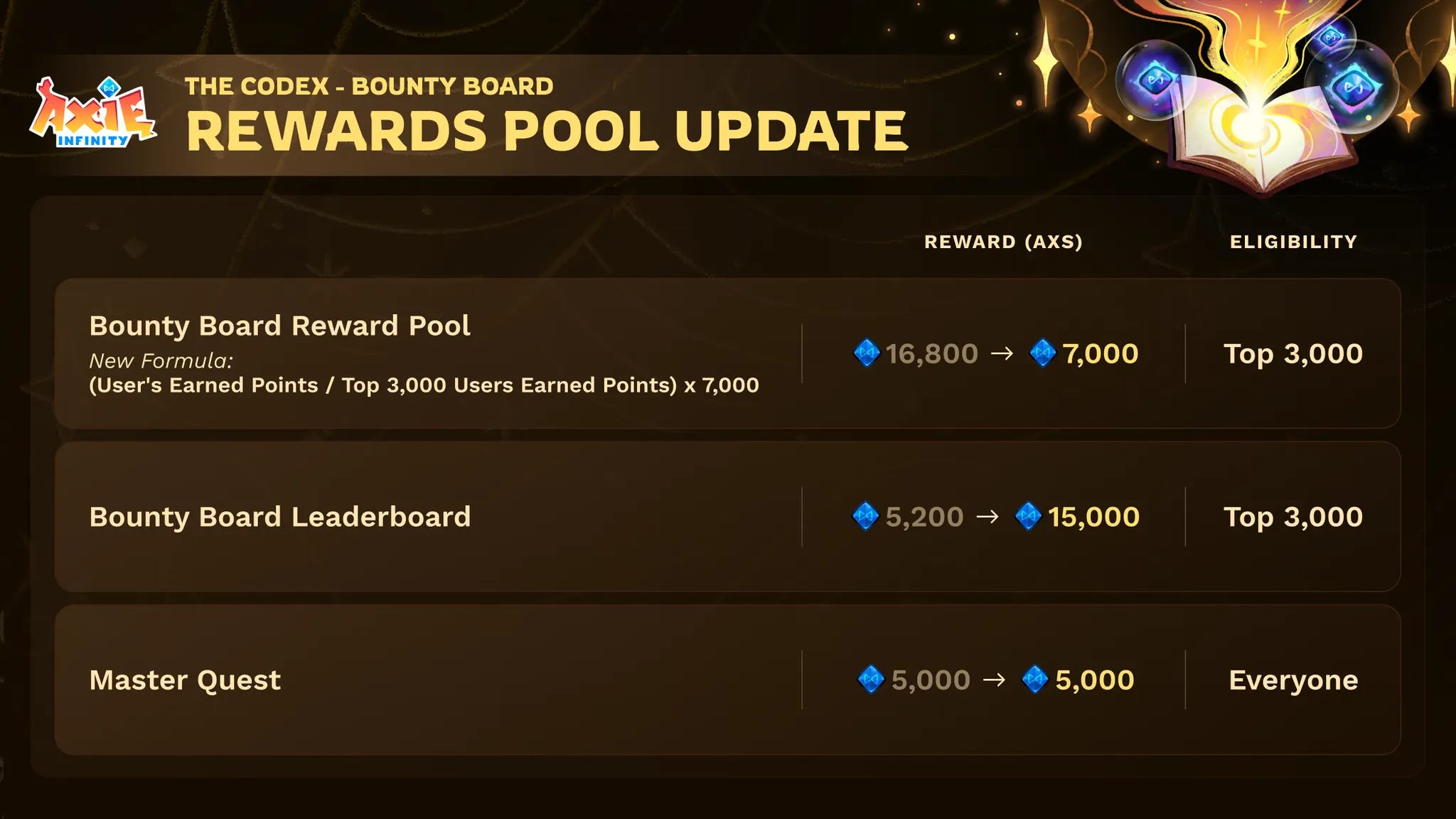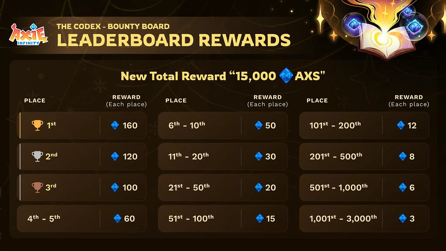 The total AXS distributed remains 27,000 AXS. This is a redistribution, not an increase. In addition to fixed leaderboard distribution, the 7,000 AXS from the general reward pool will now be distributed proportionally among the Top 3,000 players based on earned points.