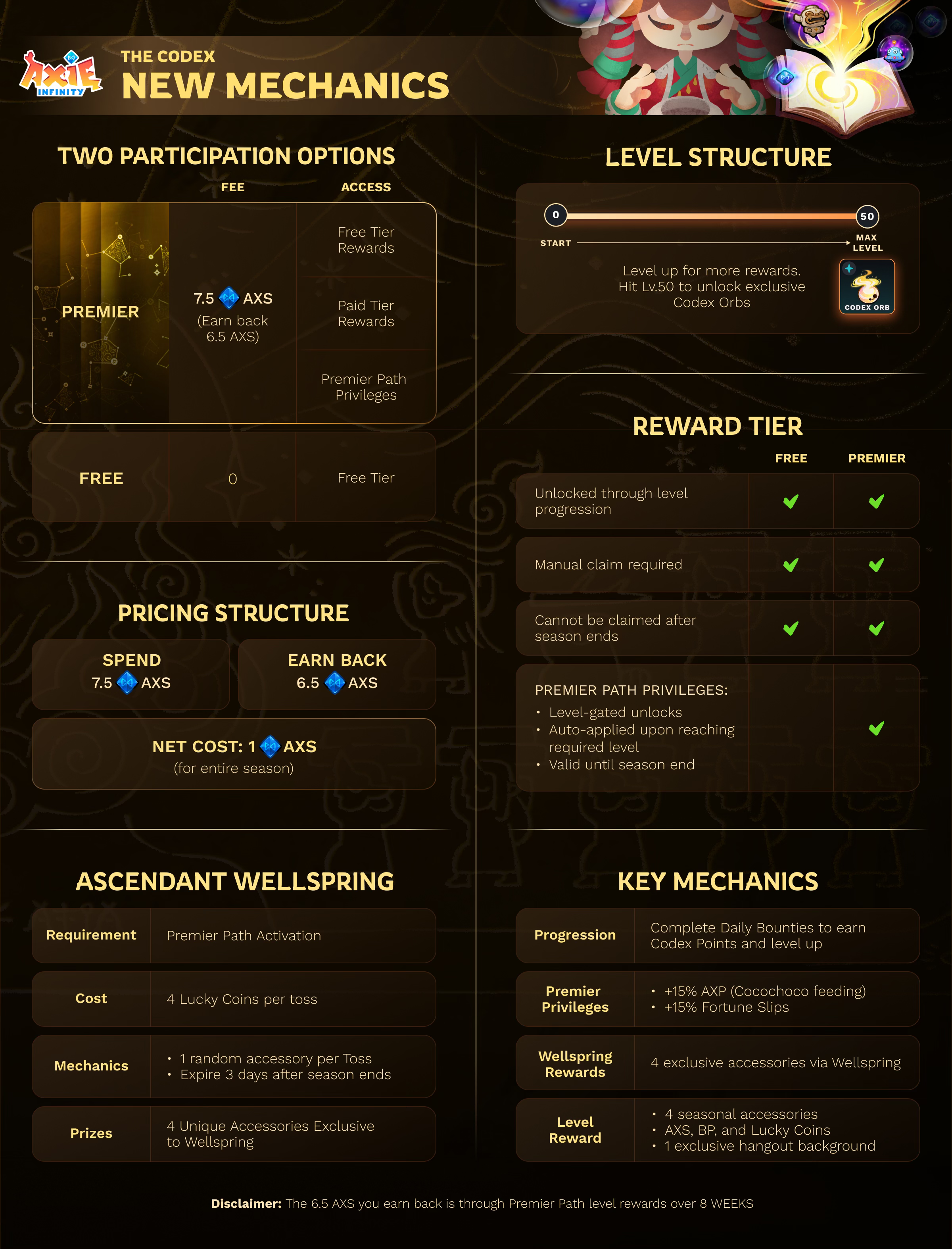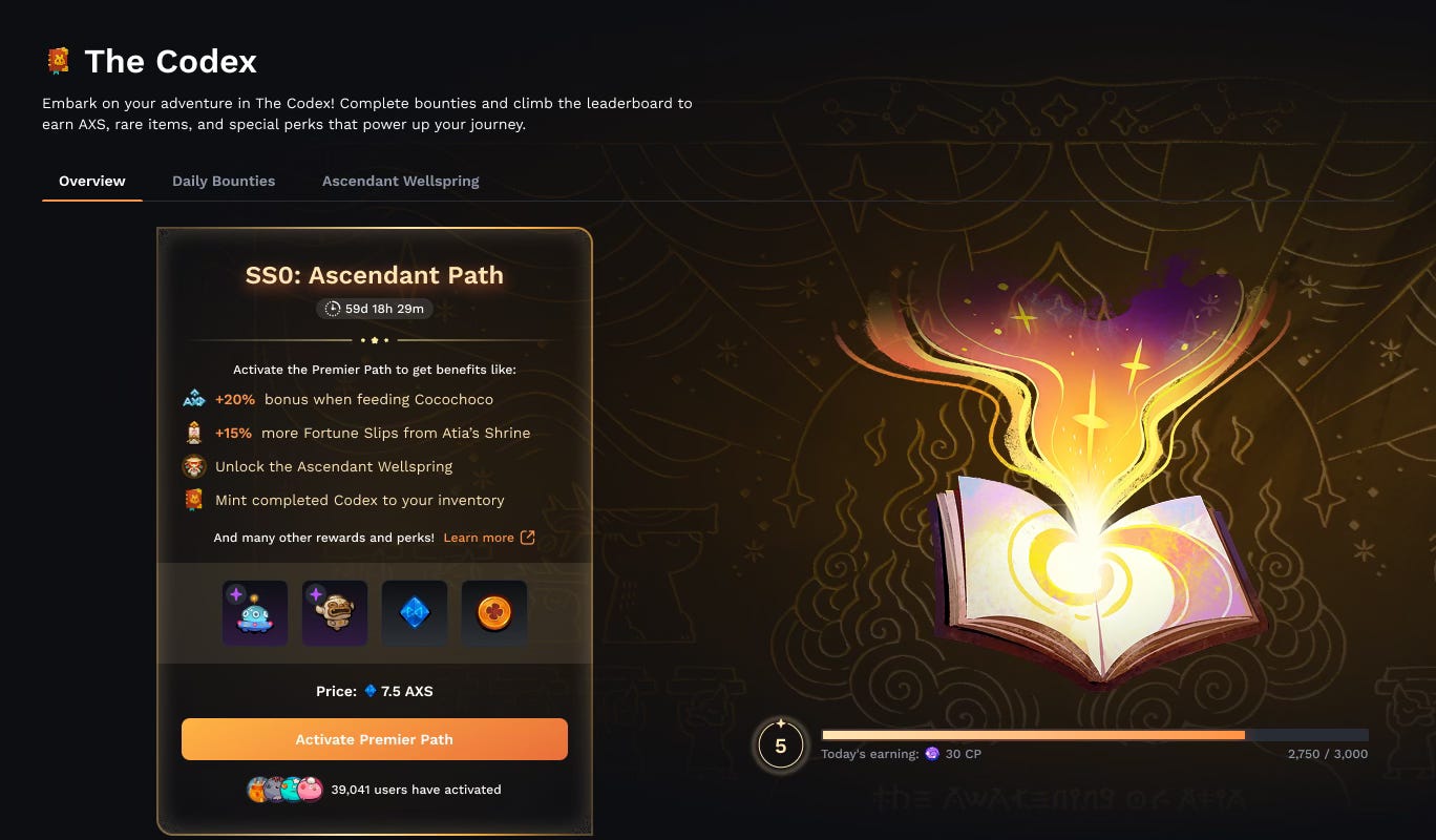 The Codex is LIVE on App.axie! Introducing a new battle pass system loaded with fresh rewards. Season 0: The Ascendant Path will be available for eight weeks, featuring a 20K AXS prize pool!