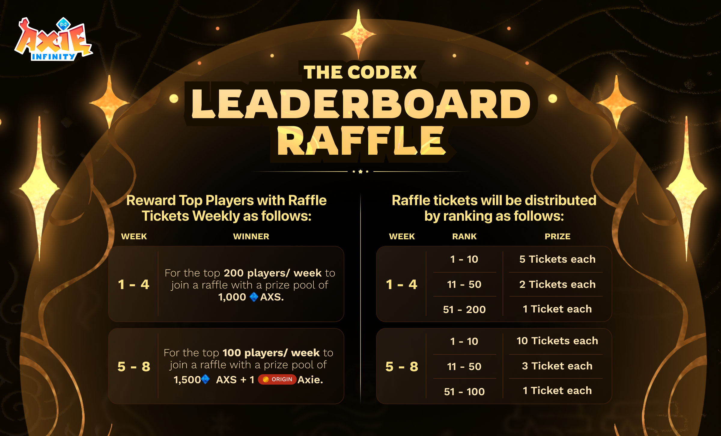 Want to earn extra AXS? Climb the Codex Leaderboard for a chance to win raffle tickets. There will be four total raffles over two phases during the Codex’s first season: The 1st raffle will have 200 winners during week 1-4, while the second raffle will have 100 winners during weeks 5-8. No extra action required to enter.