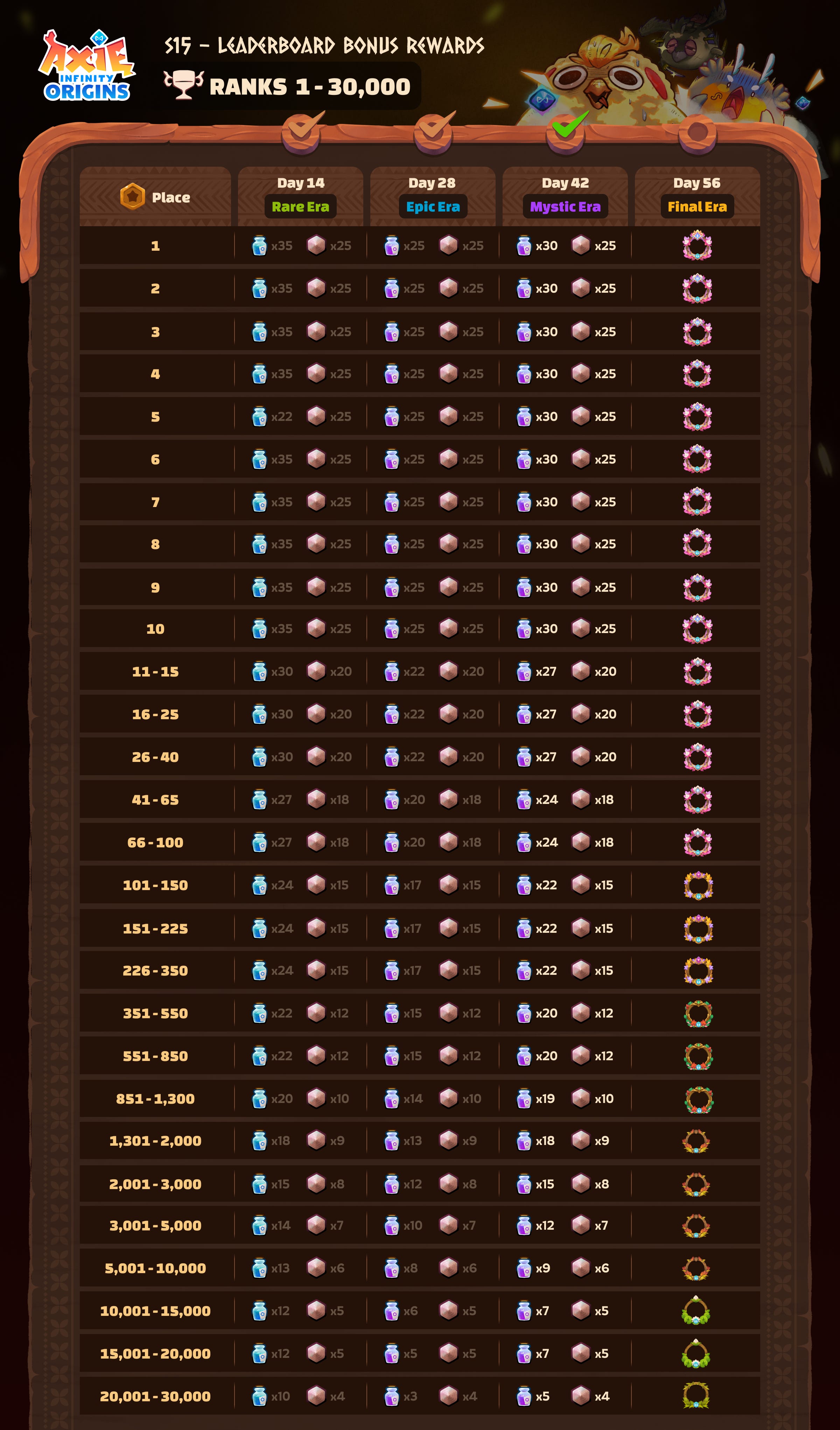 Origins S14 Mystic Era is LIVE! Jump into the arena for over 14K AXS and bonus rewards. Congrats to LVM | Vitin for climbing to the top during the Epic Era! Who will finish at the top this era? Let’s find out in the arena: